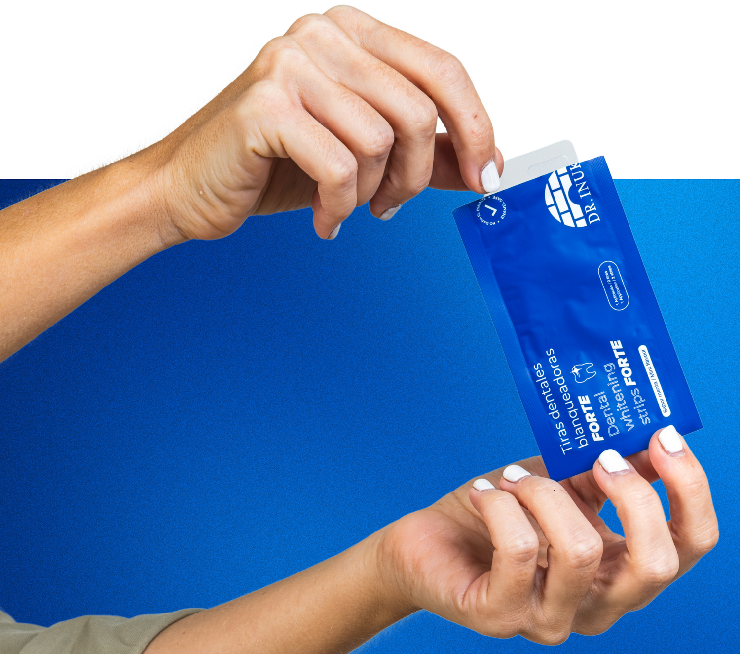 Coloca la tira superior (más grande) sobre los dientes superiores y la tira inferior (más pequeña) sobre los dientes inferiores.