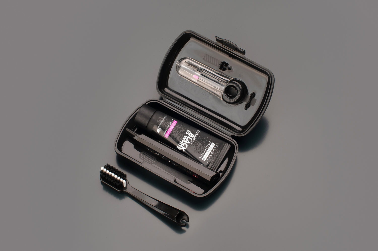 - Cepillar los dientes con el cepillo dental de viaje y la pasta de dientes Black is white para eliminar las manchas con suavidad.